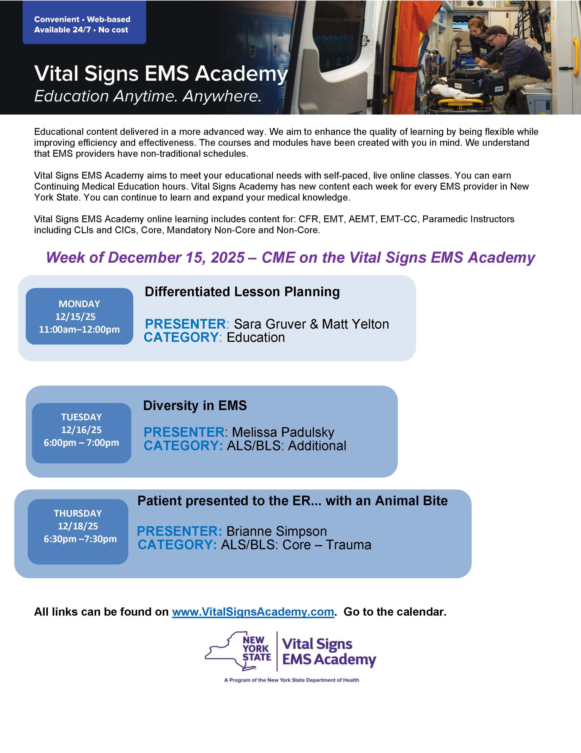 Please see the Vital Signs EMS Academy Training for the week of December 8, 2025. Please click the link below to see the flyer.