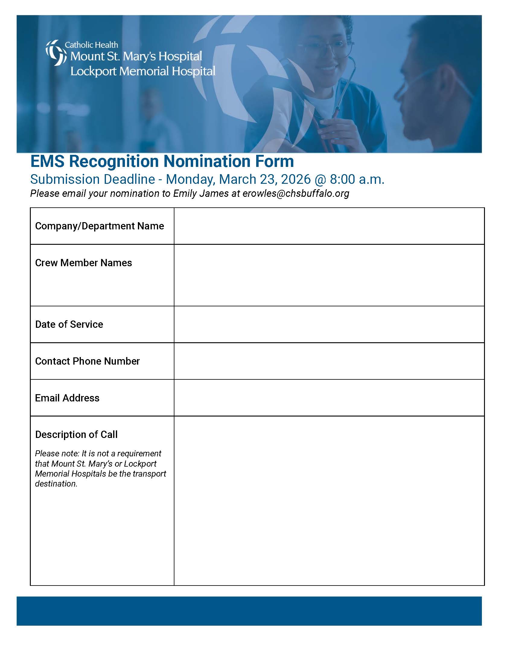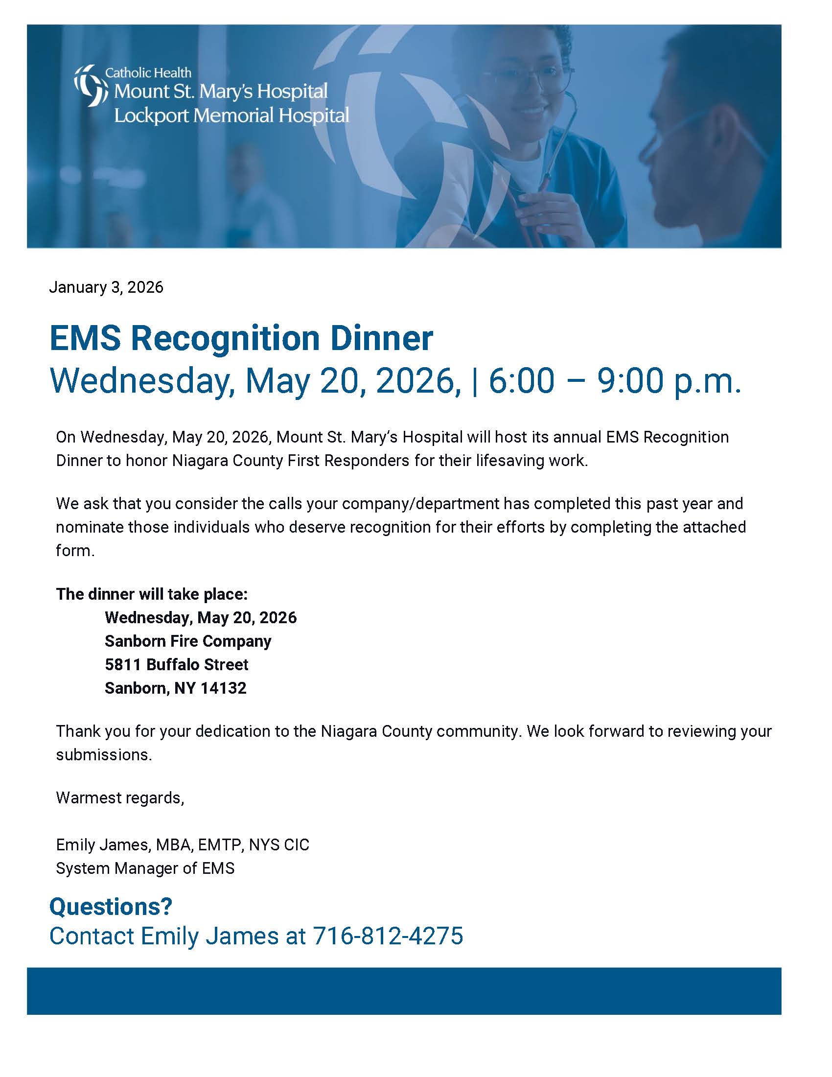Please see this announcement from our partners at Catholic Healthcare systems regarding the Mount St. Mary’s EMS Recognition Dinner. the link to print the announcement is here: http://ubmdems.com/wp-content/uploads/2026/01/MSMLMHEMSNomletter2026.pdf